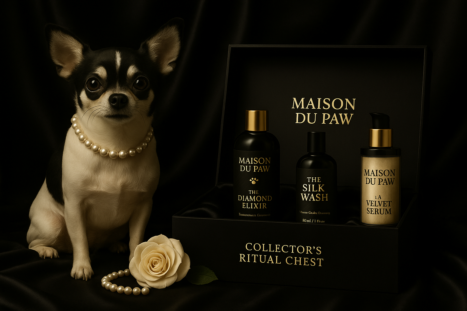 The pinnacle of luxury pet care — the Maison Du Paw Collector’s Ritual Chest is a numbered, limited-edition set featuring The Diamond Elixir, The Silk Wash, and The Velvet Serum